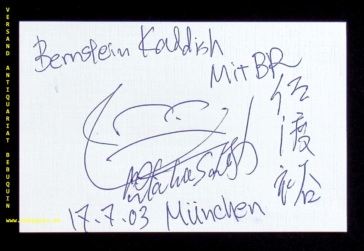 SADO, Yutaka (Dirigent): eigenhändig zweisprachig signierte und datierte Autogrammkarte. München (Herkulessaal), 17.7.2003. 8 x 12,5 cm. Karteikarte. Yutaka Sado (* 13. Mai 1961 in Kyoto, Präfektur Kyoto) ist einer der international bekanntesten japanischen Dirigenten und seit 2015 Chefdirigent des Tonkünstler-Orchesters Niederösterreich. (Wikipedia)
