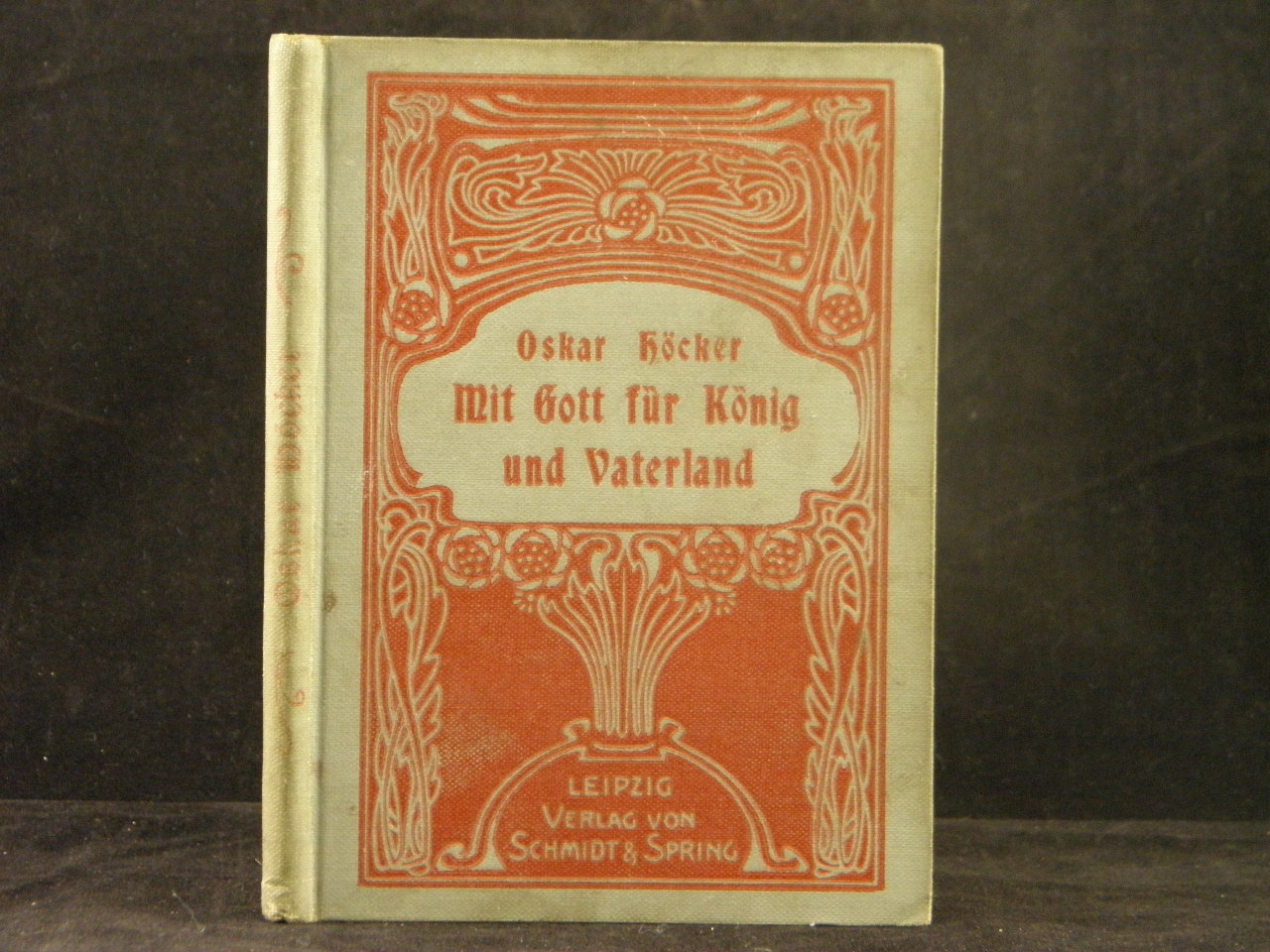 HÖCKER, Oskar: Mit Gott für König und Vaterland! oder Der Freiheit Morgenrot. Vaterländische Erzählung aus den Jahren 1808 und 1809. Stuttgart (Schmidt & Spring), (1897). 12°. 107 S. mit 4 Bildern. ill. OLn mit Jugendstilornamentik. Einband leicht angeschmutzt. 1. Aufl. dieser Ausgabe. Klotz 2729/59.