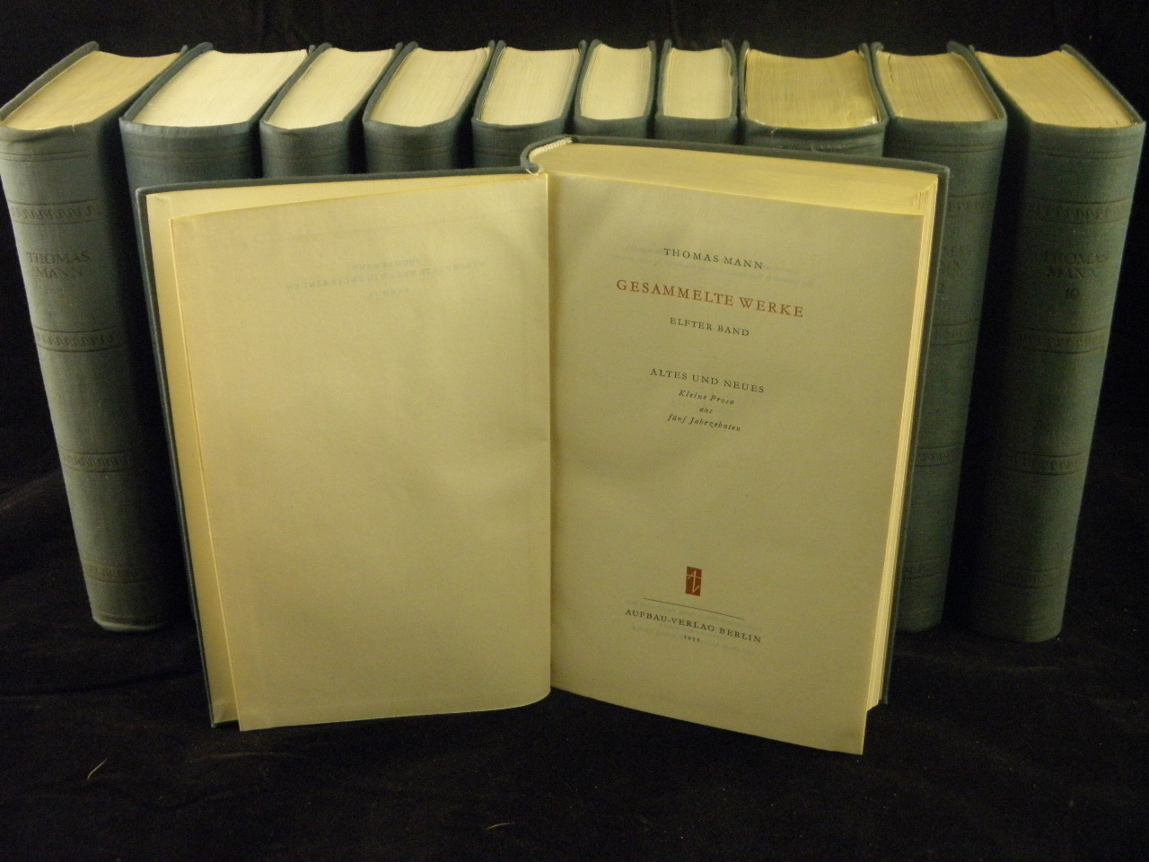 MANN, Thomas: Gesammelte Werke in 11 (von 12) Bänden. 11 Bände. Berlin (Aufbau), 1955. ca 9000 S. grünes OLn. Rücken einheitlich geblichen, es fehlt der Band 3 (Joseph und seine Brüder. Die Geschichten Jakobs, Der junge Joseph.) insgesamt gutes Ex. EA WG² 141 dieser zum 80. Geburtstag des Dichters veranstalteten Werkausgabe, zugleich Ausgabe 1. Hand, die in Konzeption und Zusammenstellung mit den Wünschen des Autors übereinstimmt. Handbuch der Editionen 400.