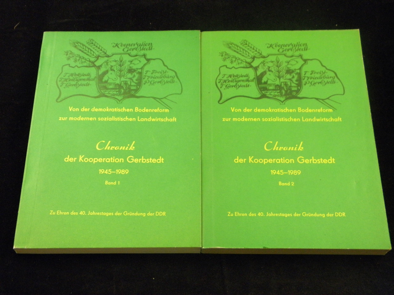 GERBSTEDT.– LUCAS, Gerhard + WERTHMANN, Wolfgang: (Hrsg.) Die Agrarpolitik der SED, dargestellt am Beispiel der Kooperation Gerbstedt. Erinnerungen – Ergebnisse – Erfahrungen. 2 Bände. Gerbstedt, 1989. 233, 277 S. mit zahlr. Abb. ill. OKart. Schnitt mit Fleck, dieser teils etwas durchgeschlagen, sonst wie neu. sehr seltene Veröffentlichung zu Ehren des 40. Jahrestages der DDR.