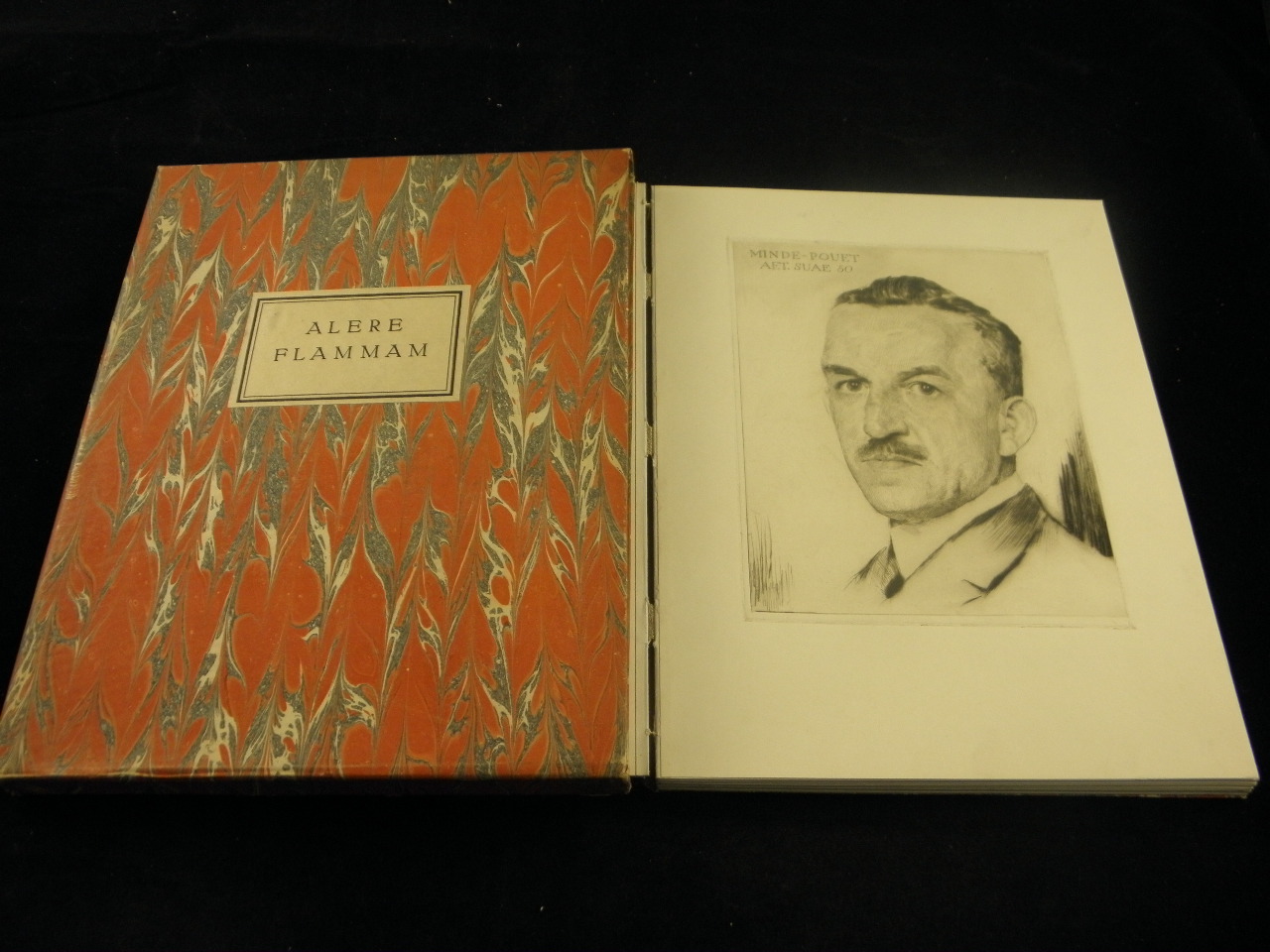 TIEMANN.– SEEMANN, Artur: (Vorwort) Alere flammam. Georg Minde-Pouet zum fünfzigsten Geburtstage gewidmet von den wissenschaftlichen Beamten der Deutschen Bücherei … und der Gesellschaft der Freunde der Deutschen Bücherei. Leipzig (Gesellschaft der Freunde der Deutschen Bücherei), 1921. 4°. 169 S. mit zahlr. Bildtafeln + 1 Originalradierung von Walter Tiemann als Frontspiz. mormorierter OPb mit OSchuber. feines Ex. EA.