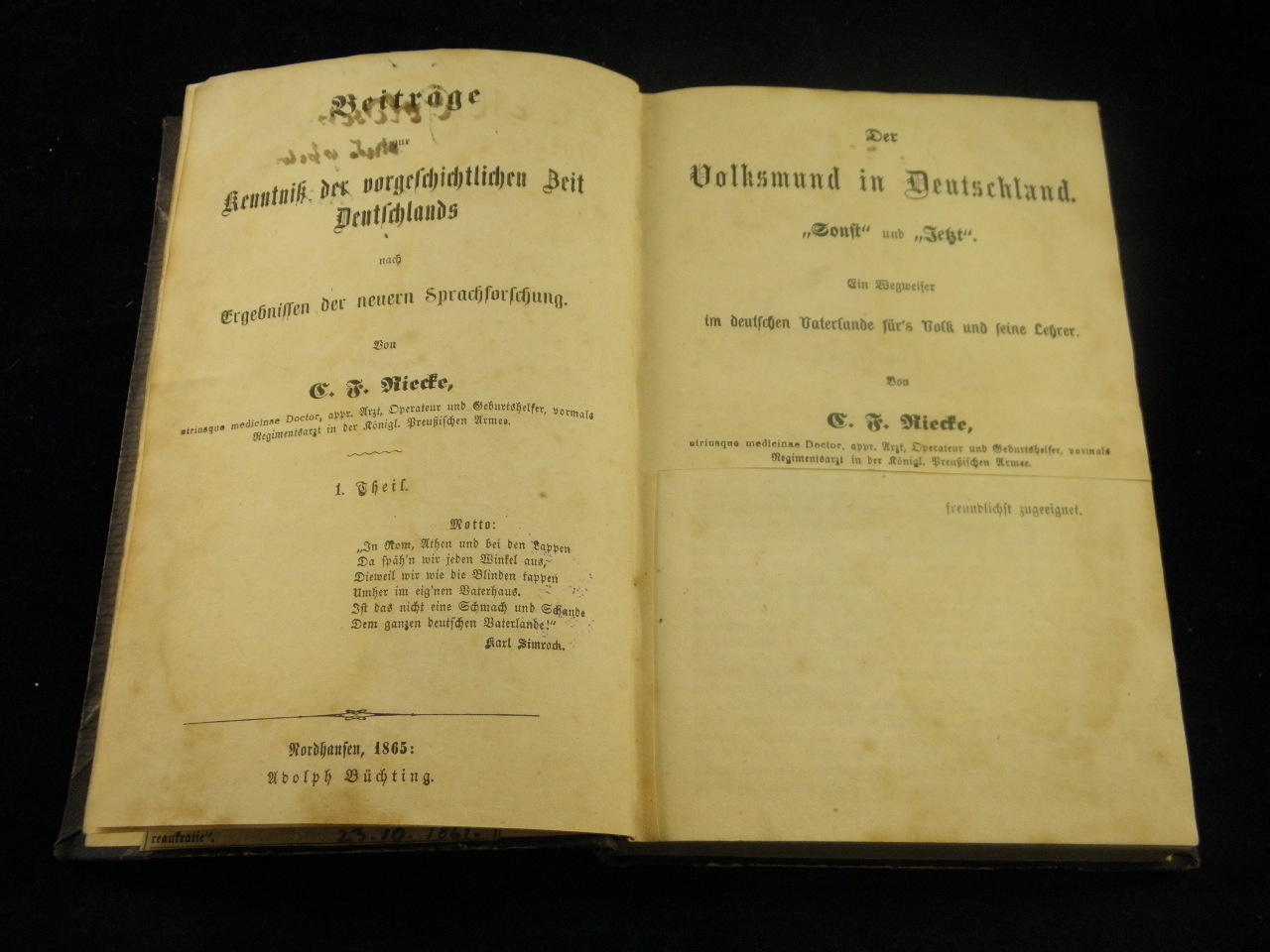 GERMANISTIK.– RIECKE, C.F.: Der Volksmund in Deutschland „sonst“ und „jetzt“. Ein Wegweiser im deutschen Vaterlande für’s Volk und seine Lehrer. Nordhausen (Büchting), 1865. XXXII, 306 (2) S. HLn der Zeit. WaV, Titelseite mit Abschnitt und Verlust der unteren (wohl unbedruckten) Hälfte. = Beiträge zur Kenntniß der vorgeschichtlichen Zeit Deutschlands nach Ergebnissen der nerern Sprachforschung, 1. Theil. sehr seltene EA.