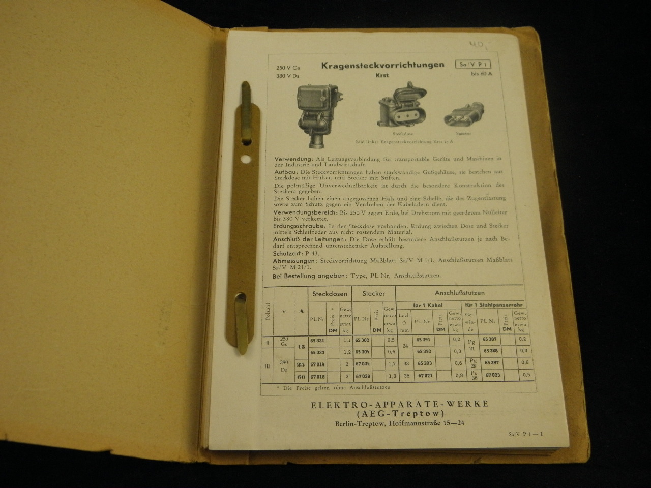 TECHNIK.– AEG TREPTOW: Abmessungen der Schaltgeräte. Katalog. Berlin (Elektro Apparate Werke), ca 1940. ca 100 S. mit zahlr. Abb. und Schlatbildern in Ringheftbindung. ill. OKart. gutes Ex. interessantes Dokument aus der Übergangszeit von AEG zu AT.