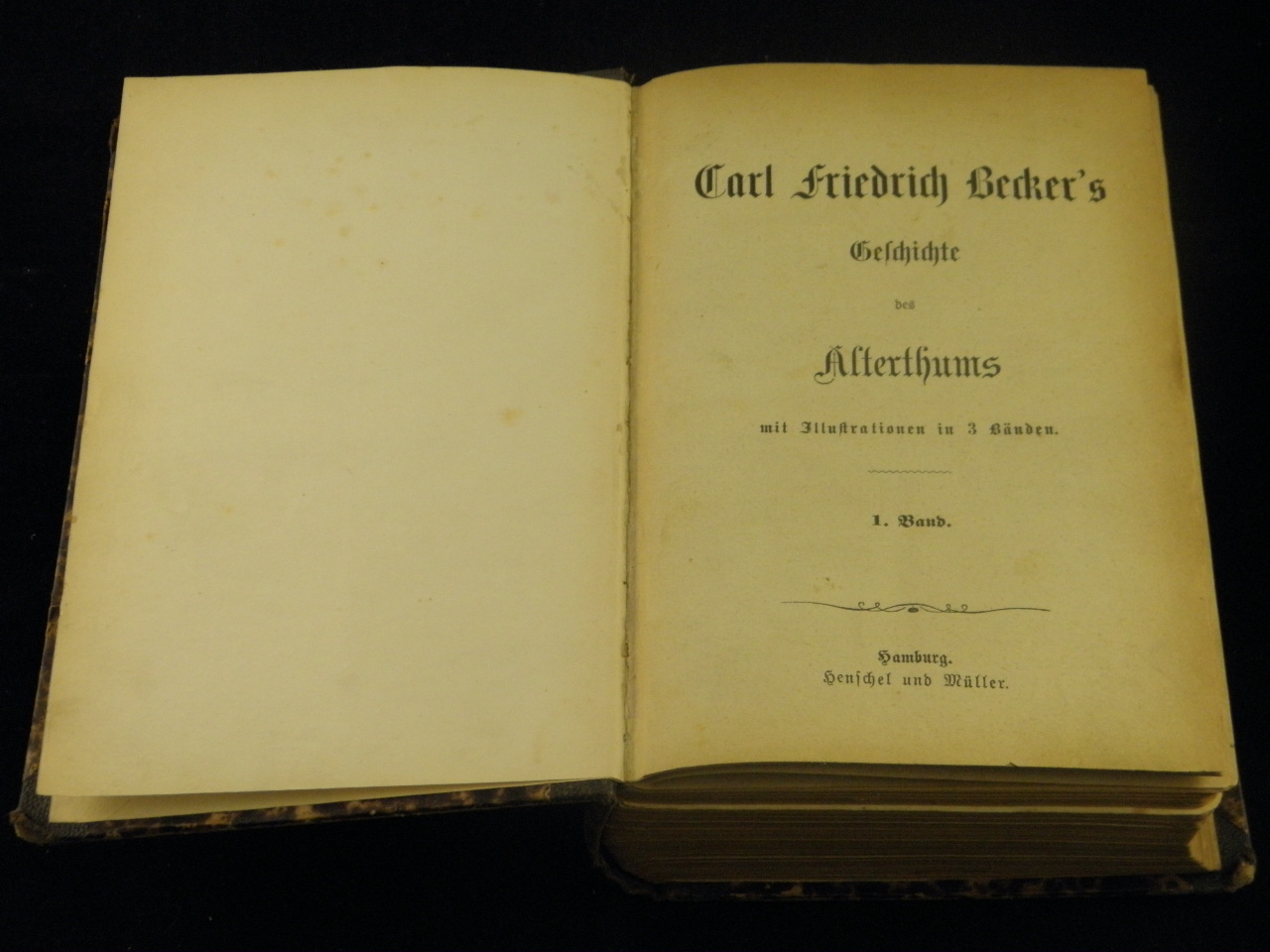 BECKER, Carl Friedrich: Geschichte des Alterthums. 3 Bände. Hamburg (Henschel und Müller), 1874. 477, 480, 137 S. mit zahlr. Bildtafeln. HLn der Zeit. Rücken mit leichter Knickspur, insgesamt etwas gebräunt, noch gut erhalten. EA mit den Portraittafeln.