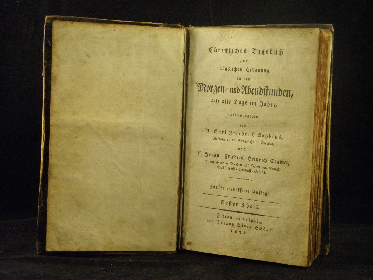 LOHDIUS, Carl Friedrich + CRAMER, Johann Friedrich Heinrich: (Hrsg.) Christliches Tagebuch zur häuslichen Erbauung in den Morgen- und Abendstunden, auf alle Tage im Jahre. 5. verbesserte Aufl. Zittau, Leipzig (Schöps), 1823. 744 S. Hldr der Zeit. Kanten und Deckel berieben, Gelenke etwas gelockert, etwas bestaubt.