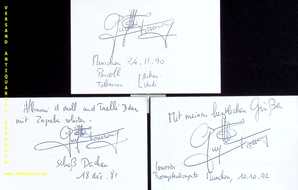 TOUVRON, Guy (Trompeter): 3 eigenhändig signierte und datierte Autogrammkarten. München (Philharmonie), 1981 – 1992. 8 x 12,5 cm. 3 Karteikarten. Guy Touvron (* 15. Februar 1950 in Vichy) ist ein klassischer Trompeter und Hochschullehrer in Paris. (Wikipedia)