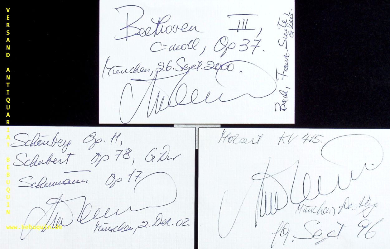 UCHIDA, Mitsuko (Pianistin): 3 eigenhändig signierte und datierte Portraitseite. München (Herkulessaal), 1996 – 2002. 8 x 12,5 cm. 3 Karteikarten. Dame Mitsuko Uchida (* 20. Dezember 1948 in Atami) ist eine britische Pianistin japanischer Herkunft. (Wikipedia)