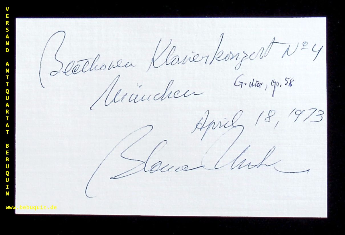 URIBE, Blanca (Pianistin): eigenhändig signierte und datierte Autogrammkarte. München (Herkulessaal), 18.4.1973. 8 x 12,5 cm. Karteikarte. Blanca Uribe (1940—) – Pianist. Born in Bogota, Colombia into a family of many generations of professional musicians. She studied in Vienna at the Academy of Music and Dramatic Art with Richard Hauser and in New York at The Juilliard School with Rosina Lhevinne and Martin Canin. Her extensive repertoire ranges from Scarlatti to works of the present. Particularly notable are her interpretations of the 32 Sonatas of Beethoven, which she performed in cycle on several occasions, and the complete Iberia of Isaac Albéniz.