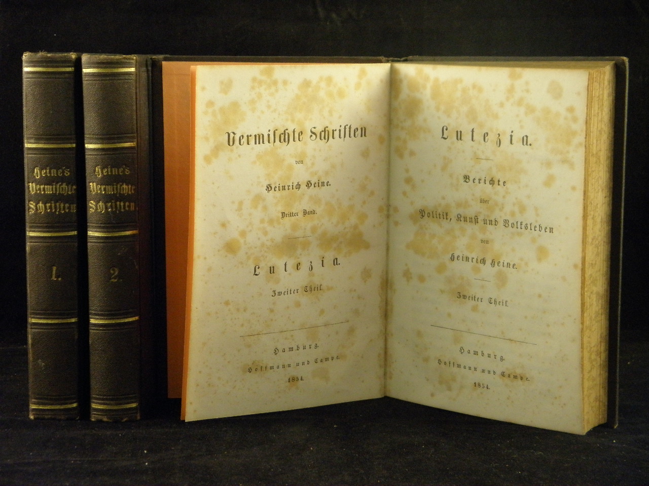 HEINE, Heinrich: Vermischte Schriften Gedruckt bei Heinrich Hotop, Kassel. 3 Bände. Hamburg (Hoffmann & Campe), 1854. 12°. 322, XVIII, 319, 310 S. PB der Zeit mit goldgeprägten Rücken. Schnitt und Titelseiten stockfleckig, sonst gut. EA. WG² 27; Wilhelm / Galley 570. Gedruckt bei Heinrich Hotop, Kassel. Enthält: 1. Geständnisse. Gedichte 1853-1854. Die Götter im Exil. Die Göttin Diana. 2. Lutezia Teil 1. 3. Lutezia Teil 2.