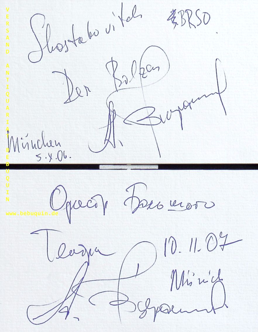 VEDERNIKOV, Alexander (Dirigent): 2 eigenhändig signierte und datierte Autogrammkarten. München (Herkulessaal), 2006 + 2007. 8 x 12,5 cm. 2 Karteikarten. Alexander Alexandrowitsch Wedernikow (* 11. Januar 1964 in Moskau, Sowjetunion; † 29. Oktober 2020 ebenda, Russland) war ein sowjetischer bzw. russischer Dirigent. Er starb am 29. Oktober 2020 unter Komplikationen mit einer SARS-CoV-2-Infektion während der COVID-19-Pandemie in Russland im Alter von 56 Jahren in Moskau. (Wikipedia)