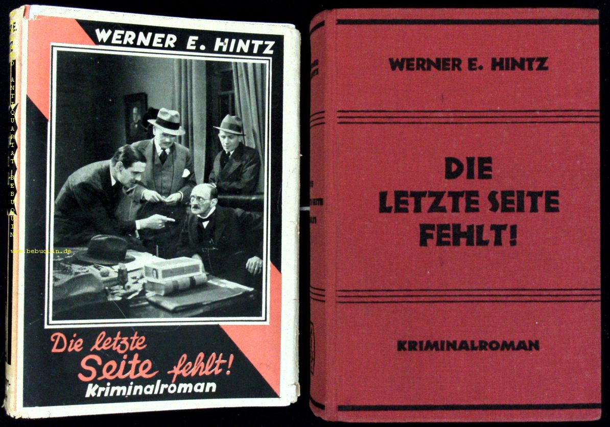 HINTZ, Werner E.: Die letzte Seite fehlt. Kriminalroman. Berlin (Otto Uhlmann), 1935. 271 S. OLn. mit OUmschl. Umschlag mit leichten Randläsuren, sont gutes Ex. = Uhlmann – Bücher. EA des seltenen Krimis. (Schädel 3473)
