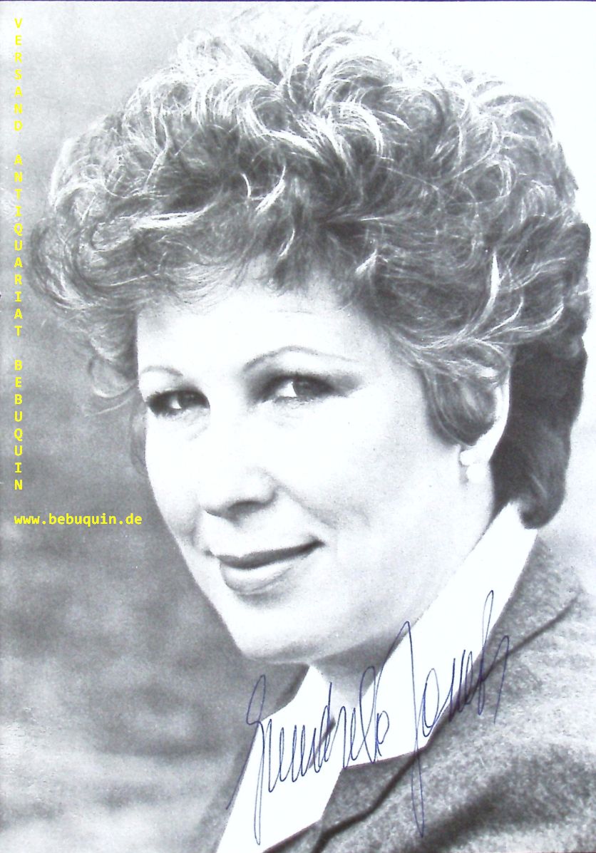 JANOWITZ, Gundula (Sopran): eigenhändig signierte Portraitseite. München, ca 1980. 21 x 15 cm. 1 Bl. Gundula Janowitz (* 2. August 1937 in Berlin) ist eine österreichische Opern-, Oratorien- und Konzertsängerin (lyrischer Sopran). (Wikipedia)
