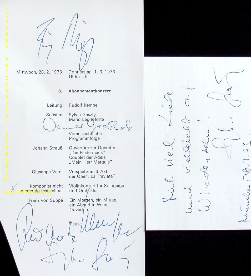 GESZTY, Sylvia (Sopran): eigenhändig signierte und datierte Autogrammkarte + eigenhändig (auch vom Dirigenten Rudolf Kempe) signierte Programmseite. München (Philharmonie), 28.2.1973. 8 x 12,5 + 20 x 10 cm. 2 Bl.