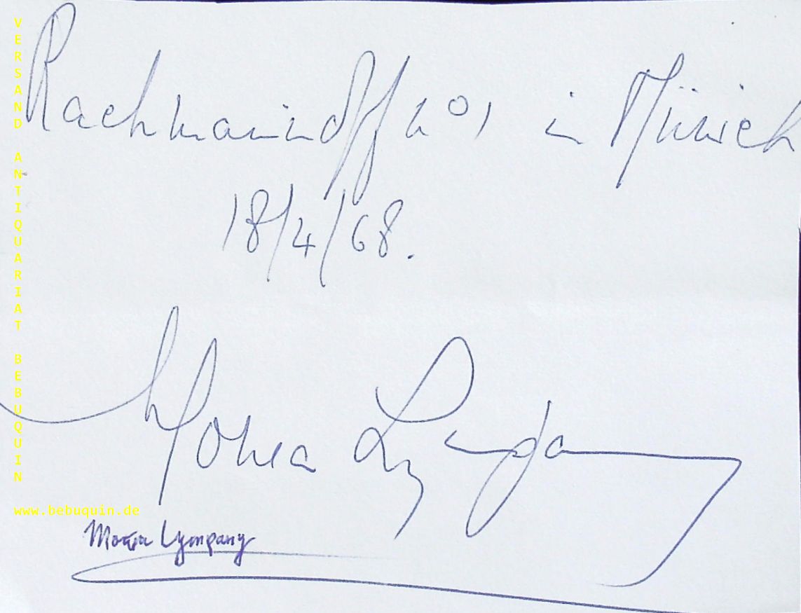 LYMPANY, Moura (Pianistin): eigenhändig signierte und datierte Programmseite. München (Herkulessaal), 18.4.1968. 11,5 x 15 cm. 1 Bl. Dame Moura Lympany (* 18. August 1916 in Saltash, Cornwall; † 28. März 2005 in Gorbio, Frankreich; geboren als Mary Gertrude Johnstone) war eine englische Pianistin. (Wikipedia)