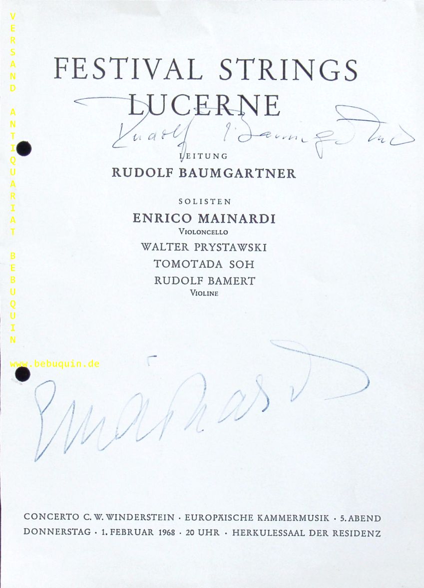 MAINARDI, Enrico (Cellist) + BAUMGARTNER, Rudolf (Dirigent): eigenhändig von beiden signierte Programmseite. München (Herkulessaaal), 1.2.1968. 21 x 15 cm. 1 Bl. seitlich gelocht. Enrico Mainardi (* 19. Mai 1897 in Mailand; † 10. April 1976 in München) war ein italienischer Cellist, Komponist und Dirigent. (Wikipedia)