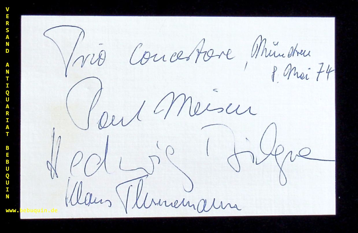 MEISEN, Paul (Flötist) + BILGRAM, Hedwig (Cembalo) + THUNEMANN, Klaus (Fagottist): eigenhändig von allen signierte und datierte Autogrammkarte + München, 9.5.1974. 8 x 12,5 cm. Karteikarte mit Beiblatt. Paul Meisen (* 19. Oktober 1933 in Hamburg; † 23. Juni 2020 in Singenbach) war ein deutscher Flötist und Hochschullehrer. (Wikipedia)