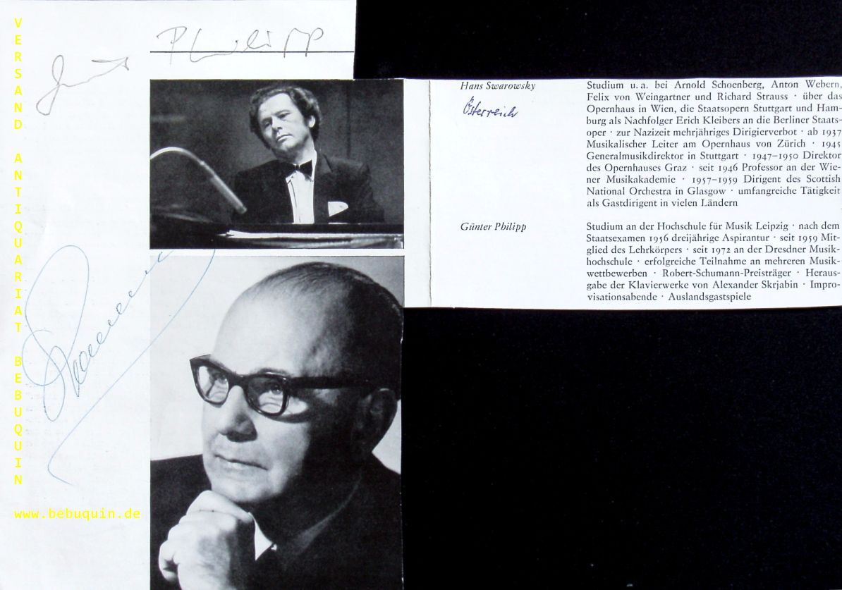 SWAROWSKY, Hans (Dirigent) + PHILIPP, Günter (Pianist, Komponist): eigenhändig von beiden signierte Portraitseite. München, Nov. 1972. 19 x 27 cm. 1 Bl. Hans Swarowsky (* 16. September 1899 in Budapest; † 10. September 1975 in Salzburg) war ein österreichischer Dirigent. Studium bei Arnold Schönberg, Anton Webern und Richard Strauss. Nachfolger von Erich Kleiber an der Berliner Staatsoper, unter den Nazis mehrjähriges Dirigierverbot. Günter Philipp (* 13. September 1927 in Sohland an der Spree) ist ein deutscher Pianist, Musikwissenschaftler, Komponist und Maler. (Wikipedia)