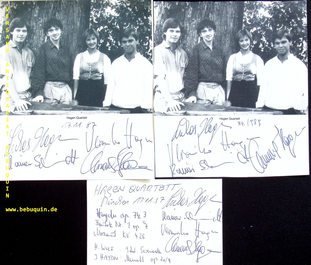 HAGEN-QUARTETT.– HAGEN, Lukas + Veronika + Clemens + SCHMIDT, Rainer: 2 eigenhändig von allen signierte und datierte Portraitseiten sowie ebensolche Autogrammkarte. München, 1985 – 1987. 17 x 14,5 cm. 6 Bl. Das Hagen Quartett ist ein in den 1970er Jahren gegründetes Streichquartettensemble aus Salzburg und gehört zu den führenden Streichquartetten der Welt. Es bestand ursprünglich aus vier Geschwistern, von denen drei nach wie vor in dem Quartett musizieren. (Wikipedia)