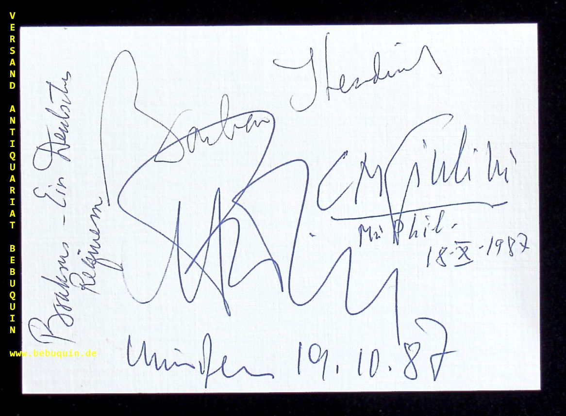 GIULINI, Carlo Maria (Dirigent) + HENDRICKS, Barbara + WEIKL, Bernd: eigenhändig von allen signierte und datierte große Autogrammkarte. München (Philharmonie), 19.10.1987. 10,5 x 14,5 cm. große Karteikarte mit interessantem Begleitmaterial. Carlo Maria Giulini (* 9. Mai 1914 in Barletta, Provinz Barletta-Andria-Trani; † 14. Juni 2005 in Brescia, Lombardei) war ein italienischer Dirigent. Barbara Hendricks (* 20. November 1948 in Stephens, Ouachita County, Arkansas) ist eine amerikanisch-schwedische Sopranistin. Bekannt als Opern- und Konzertsängerin, engagiert sie sich für die Menschenrechte. Sie lebt seit 1977 in Europa, seit 1985 in der Schweiz. Bernd Weikl (* 29. Juli 1942 in Wien) ist ein deutsch-österreichischer Opern- und Konzertsänger (Bariton), Buchautor und Opernregisseur. (Wikipedia)