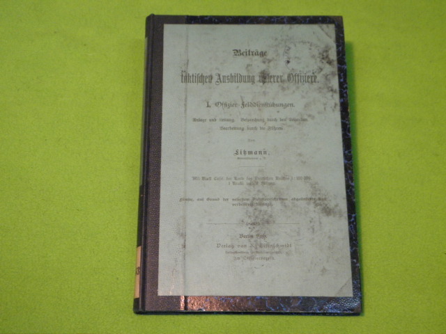 LITZMANN, Karl: Beiträge zur taktischen Ausbildung unserer Offiziere. I. Teil. Offizier – Felddienstübungen. Anlage und Leitung. Besprechung durch den Leitenden. Bearbeitung durch den Führer. 5. verbesserte Aufl. Berlin (Eisenschmidt), 1910. Gr. 8°. VIII, 140, 8 S. mit Blatt Cosel der Karte des Deutschen Reiches, 1 Kroki und 2 Skizzen. HLdr der Zeit unter Verwendung des Originaldeckels. Ordnungsgemäß aus Bundeswehrbeständen ausgesondertes Bibliotheksexemplar (Stempel, Rückenschild), gutes Ex. Selten.
