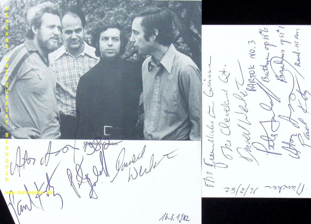 CLEVELAND QUARTETT.– WEILERSTEIN, Donald + SALAFF, Peter + ARAD, Atar + KATZ, Paul: eigenhändig von allen signierte und datierte Autogrammkarte + eigenhändig von allen signierte Portraitseite. München, 16.3.1982. 16 x 14,5 cm. 3 Bl. The Cleveland Quartet was a string quartet founded in 1969 by violinist Donald Weilerstein. He formed the group that summer at the Marlboro Music School and Festival with violinist Peter Salaff, violist Martha Strongin Katz, and cellist Paul Katz. The quartet had three personnel changes: violist Atar Arad replaced Strongin Katz in 1980; violist James Dunham then replaced Arad in 1987; and William Preucil replaced Weilerstein as first violin in 1989. The quartet disbanded in 1995. (Wikipedia)