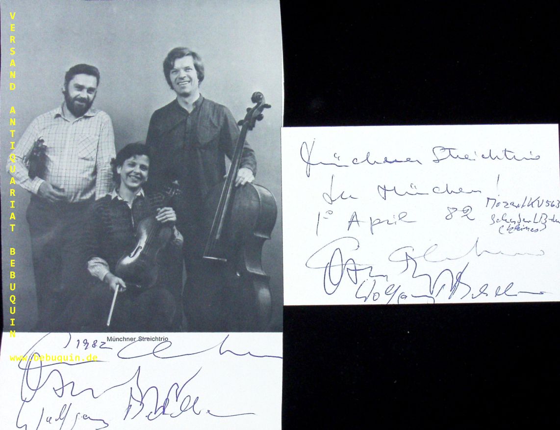 MÜNCHNER STRERICHTRIO.– CHUMACHENKO, Ana + LYSY, Oscar + MEHLHORN, Wolfgang: eigenhändig von allen signierte und datierte Autogrammkarte + eigenhändig von allen signierte Portraitseite. München, 1.4.1982. 19,5 x 13 cm. 4 Bl.