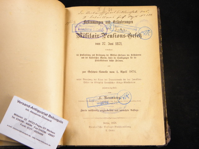 RECHTSWESEN.– NEUMANN, L.: Bestimmungen und Erläuterungen zum Militair-Pensions-Gesetz vom 27. Juni 1871. Betreffen die Pensionirung und Versorgung der Miliair-Personen des Reichsheeres udn der Kaiserlichen Marine. 2. vermehrte Aufl. Berlin (Nicolaische), 1878. 302 S. Hldr der Zeit. Ordnungsgemäß aus Bundeswehrbeständen ausgesondertes Bibliotheksexemplar (Stempel, Rückenschild), eine Ecke gestaucht.