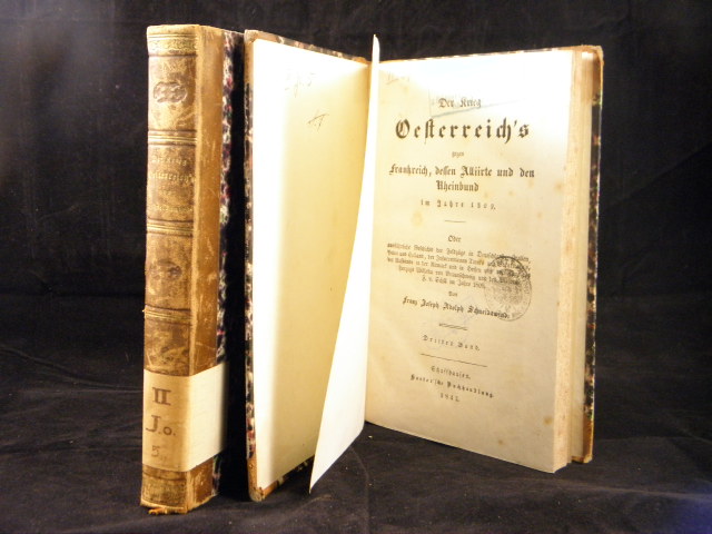 ÖSTERREICH.– SCHNEIDAWIND, Franz Joseph Adolph: Der Krieg Österreichs gegen Frankreich, dessen Alliirte und den Rheinbund im Jahre 1809. Oder ausführliche Geschichte der Feldzüge in Deutschland, Italien, Polen und Holland; der Insurrecionen Tirol’s und Vorarlber’s; der Aufstände in der Altmark und in Hessen. 2 Bände. Schaffhausen (Hurter), 1842/43. HLdr der Zeit mit goldgeprägten Rücken. HLdr der Zeit. Ordnungsgemäß aus Bundeswehrbeständen ausgesondertes Bibliotheksexemplar (Stempel, Rückenschild). EA.
