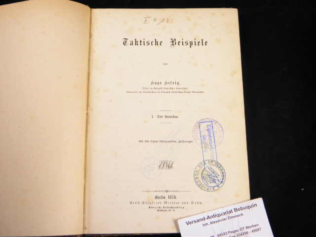 HELVIG, Hugo: Taktische Beispiele. I. Das Bataillon. Berlin (Mittler), 1874. Gr. 8°. VI, 108 S. + 108 Tafeln mit lithographischen Zeichnungen. HLn der Zeit. Ordnungsgemäß aus Bundeswehrbeständen ausgesondertes Bibliotheksexemplar (Stempel, Rückenschild). seltene EA.