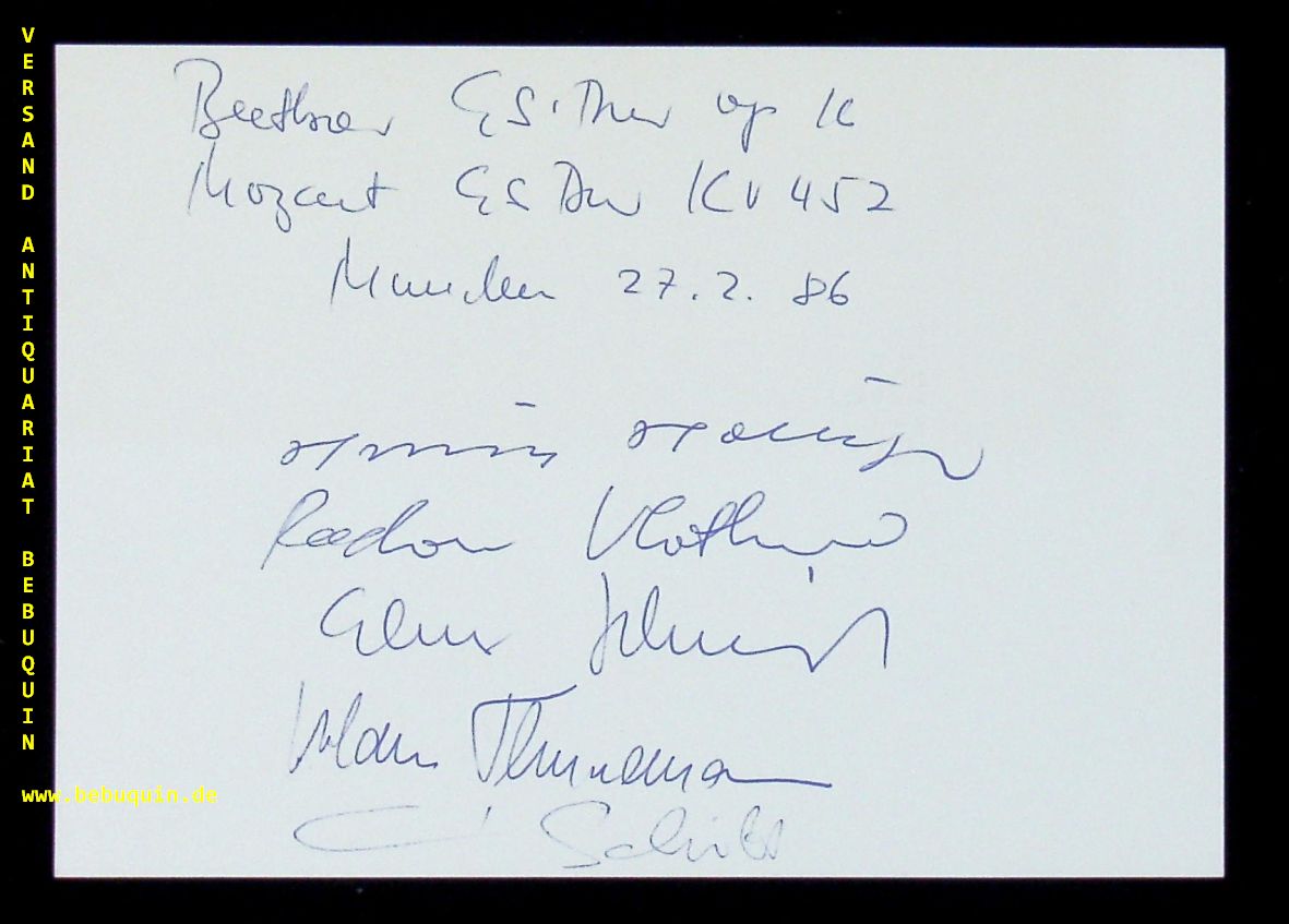 THUNEMANN, Klaus (Fagottist) + HOLLIGER, Heinz + VLATKOVIC, Radovan + SCHMID, Elmar + SCHIFF, Andras: eigenhändig von allen signierte und datierte Autogrammkarte. München (Philharmonie), 27.2.1986. 10,5 x 14,5 cm. große Karteikarte. Klaus Thunemann (* 19. April 1937 in Magdeburg) ist ein deutscher Fagottist. Sir András Schiff (* 21. Dezember 1953 in Budapest) ist ein ungarischer Pianist, Dirigent und Musikpädagoge, der auch die österreichische und britische Staatsbürgerschaft besitzt. Radovan Vlatkovic (* 29. Januar 1962 in Zagreb, Jugoslawien) ist ein kroatischer Hornist. Heinz Robert Holliger (* 21. Mai 1939 in Langenthal) ist ein Schweizer Oboist, Komponist und Dirigent. (Wikipedia)