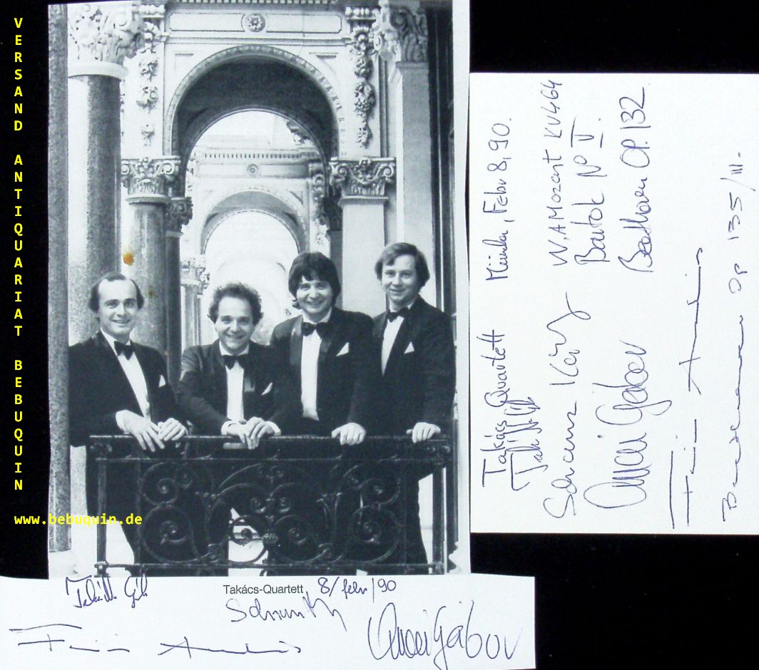 TAKACS QUARTETT.– TAKASC-NAGY, Gabor + SCHRANZ, Karoly + ORMAI, Gabor + FEJER, Andras: eigenhändig von allen vier Künstlern signierte und datierte Autogrammkarte sowie eine ebenfalls von allen signierte Portraitseite. München (Philharmonie), 8.2.1990. 18 x 15 + 8 x 12,5 cm. 6 Bl. The Takács Quartet is a string quartet, founded in Hungary, and now based in Boulder, Colorado, United States. (Wikipedia)