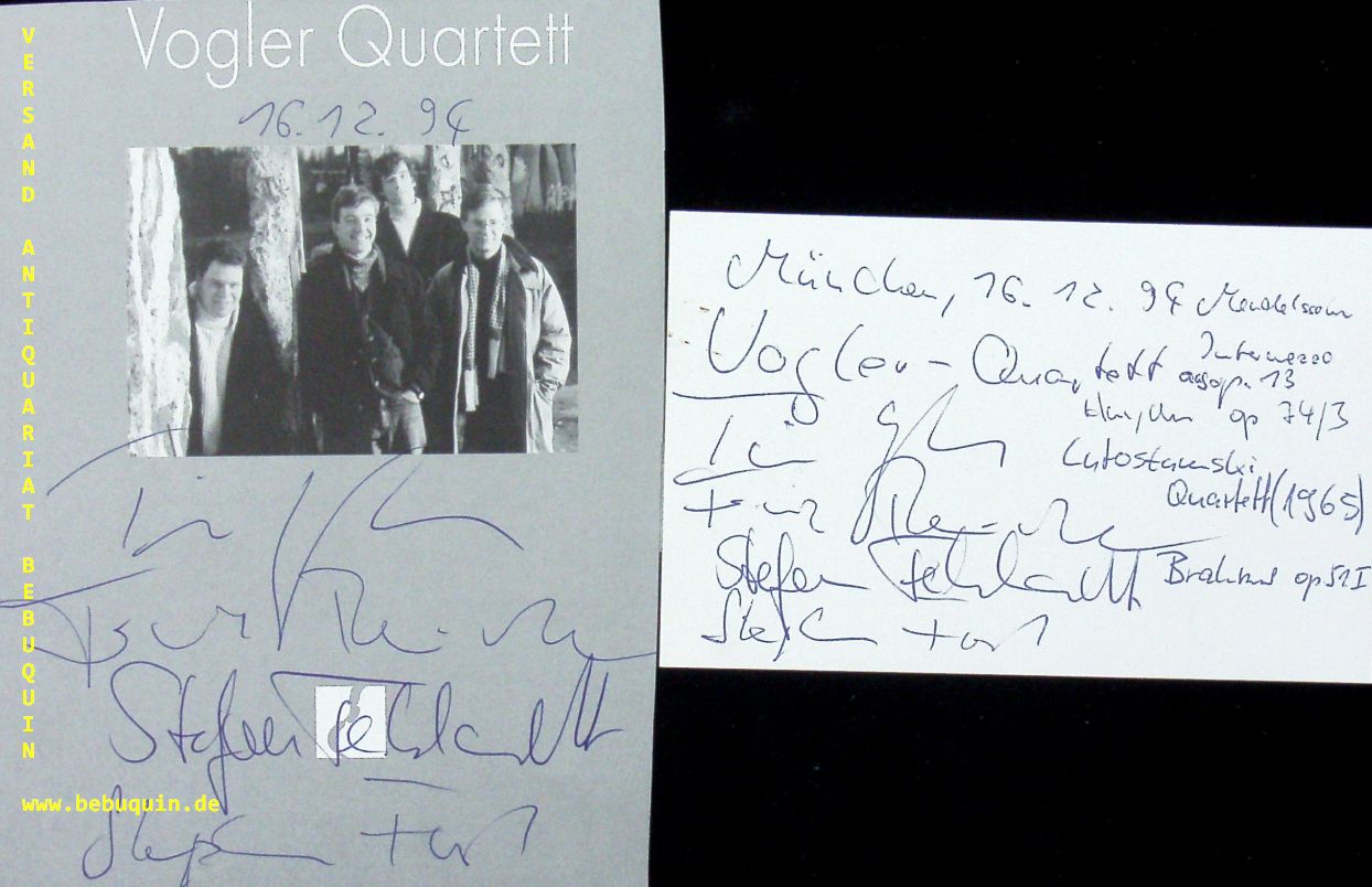 VOGLER QUARTETT.– VOGLER, Tim + REINECKE, Frank + FEHLANDT, Stefan + FORCK, Stephan: eigenhändig von allen signierte und datierte Autogrammkarte + ebensolche Portraitseite.. München (Herkulessaal), 16.12.1994. 16 x 12 + 8 x 12,5 cm. 3 Bl. Das Vogler Quartett ist ein in Berlin ansässiges deutsches Streichquartett. Es gründete sich 1985 und spielt seit Anfang 1986 in unveränderter Besetzung zusammen. (Wikipedia)