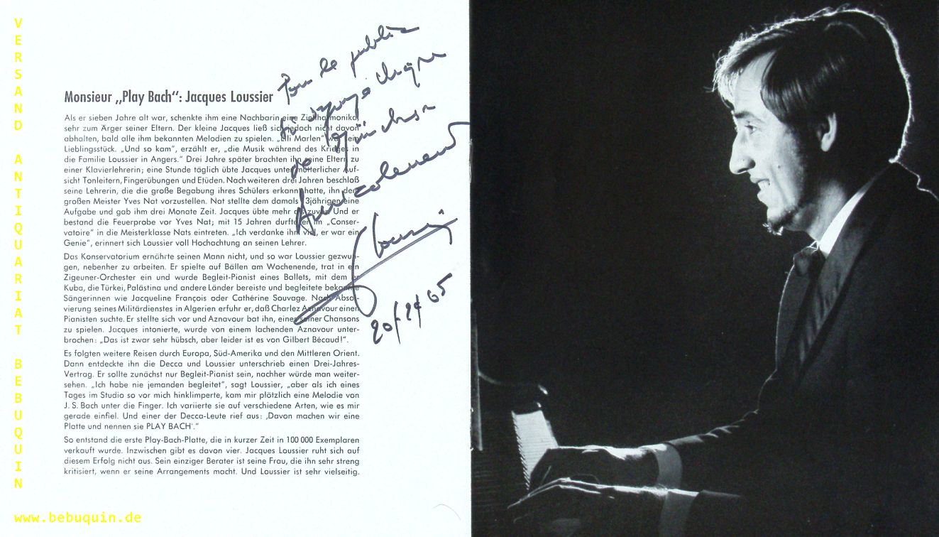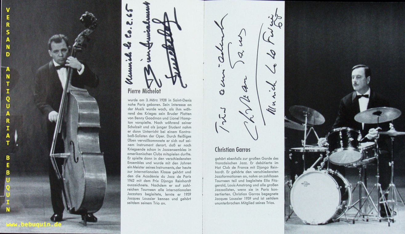LOUSSIER, Jacques + MICHELOT, Pierre + GARROS, Christian: eigenhändig von allen drei Mitgliedern des Play Bach Trios signiertes und datiertes Programmheft: Pour le public (…) de München. München (Herkulessaal), 20.2.1965. 20 x 17 cm. 12 S. mit zahlr. Bildern. ill. OKart. = 1. Deutschland Tournee 1965. Jacques Loussier (* 26. Oktober 1934 in Angers; † 5. März 2019 in Blois) war ein französischer Pianist, Komponist und Arrangeur. Bekannt wurde er mit seinen verjazzten Interpretationen von Werken Johann Sebastian Bachs. Auf diese ungewöhnliche Kombination war Loussier 1959 während seines Studiums gestoßen und gründete dazu mit dem Bassisten Pierre Michelot und dem Schlagzeuger Christian Garros das Play Bach Trio. (Wikipedia)