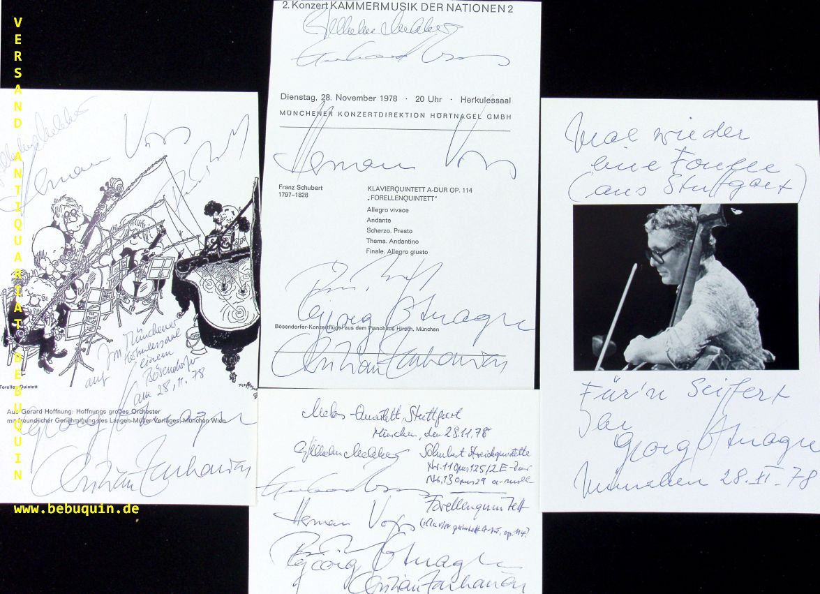 MELOS QUARTETT.– HÖRTNAGEL, Georg (Bassist) + ZACHARIAS, Chrsitian (Pianist) + MELCHER, Wilhelm + VOSS, Gerhard + Hermann + BUCK, Peter: 5 eigenhändig von allen oder Einzelnen signierte und datierte Autogrammkarten und Programmseiten. München (Philharmonie), 28.11.1978. 10,5 x 14,5 cm. 7 Bl. Christian Zacharias (* 27. April 1950 in Jamshedpur, Indien) ist ein deutscher Pianist und Dirigent. Georg Hörtnagel (* 12. März 1927 in München; † 1. Mai 2020) war ein deutscher Kontrabassist und Konzertagent. Das Melos Quartett mit Sitz in Stuttgart zählte zu den renommierten Streichquartettensembles der Welt. Es wurde 1965 von Wilhelm Melcher (1. Violine), Gerhard Voss (2. Violine), Hermann Voss (Viola) und Peter Buck (Cello) gegründet und bestand 40 Jahre lang bis zum Jahr 2005. (Wikipedia)