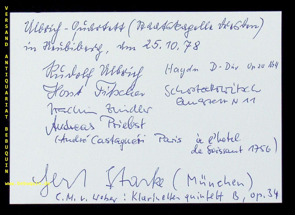 ULBRICH QUARTETT.– STARKE, Gert + ULBRICH, Rudolf + TITSCHER, Horst + ZINDLER, Joachim + PRIEBST, Andreas: 5 eigenhändig von allen signierte und datierte Autogrammkarte. München (Philharmonie), 25.10.1978. 10,5 x 14,5 cm. Karteikarte.