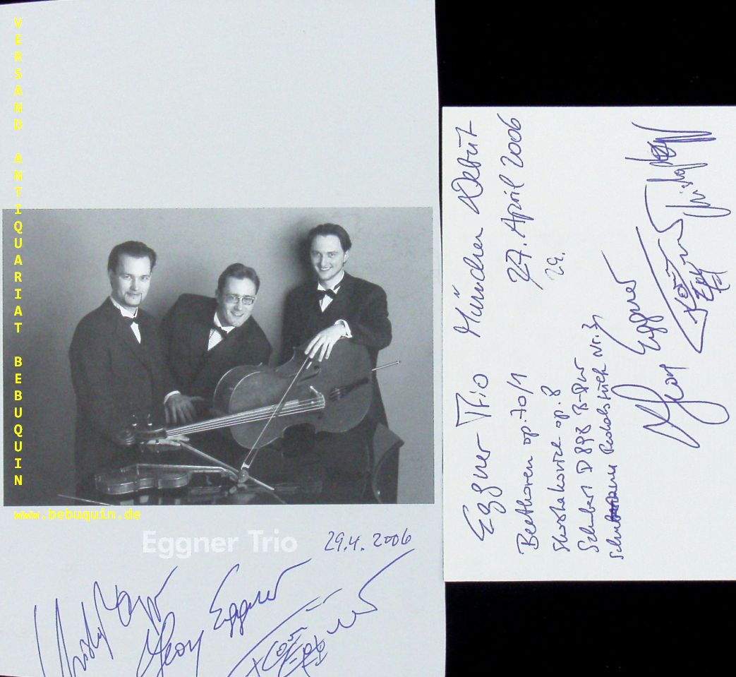 EGGNER TRIO.– EGGNER, Georg + Florian + Christoph: eigenhändig von allen signierte und datierte Autogrammkarte + von allen signierte und datierte Portraitseite. München (Philharmonie), 29.4.2006. 19,5 x 13 cm. 3 Bl. Portraitseitenautogramm etwas beschnitten.