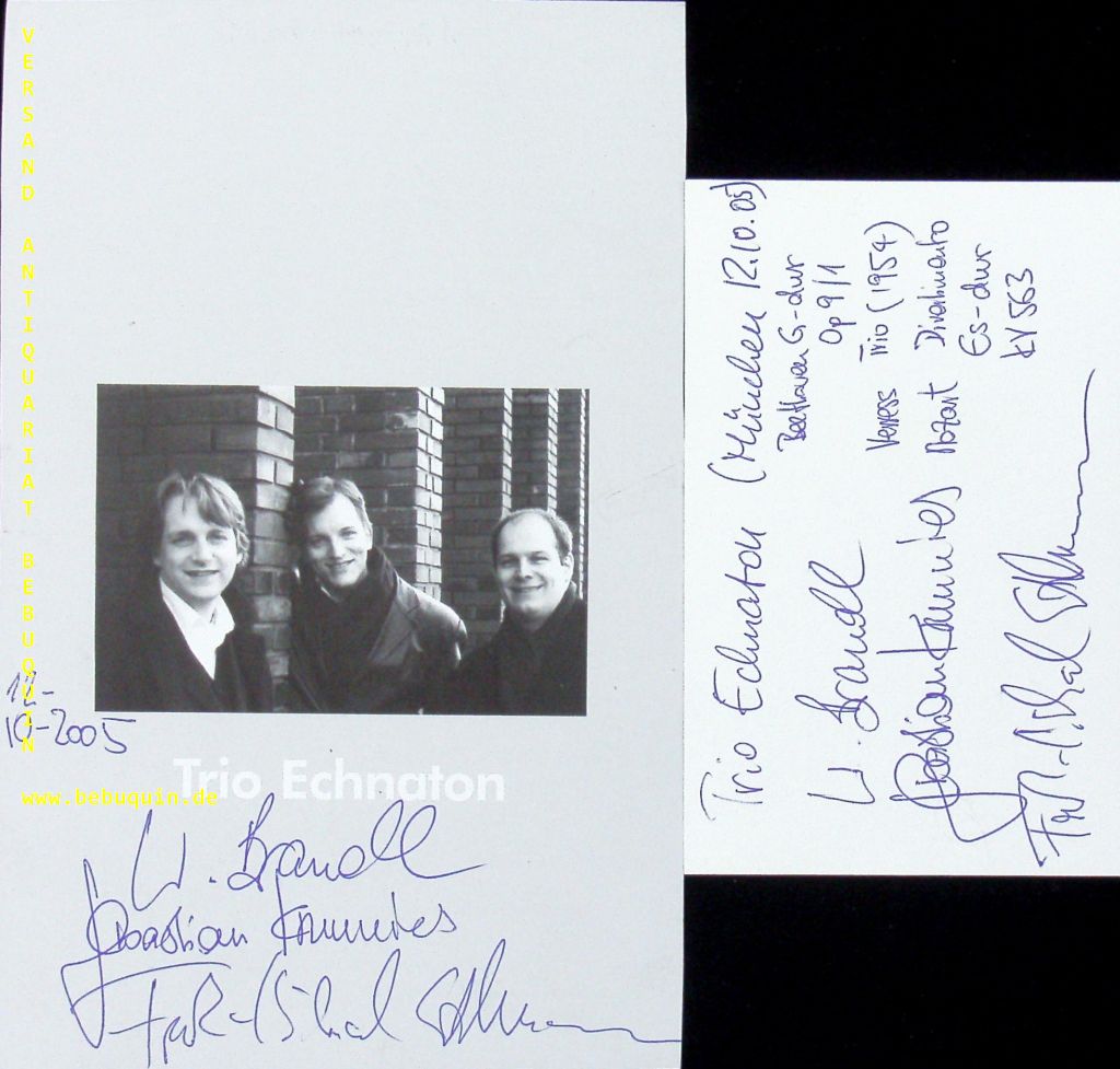 TRIO ECHNATON.– BRANDL, Wolfgang + KRUNNIES, Sebastian + GUTHMANN, Frank-Michael: eigenhändig signierte und datierte Autogrammkarte + signierte Portraitseite. München (Herkulessaal), 12.10.2005. 19,5 x 12,5 cm. 3 Bl. Seit seiner Gründung 1995 in Karlsruhe erhielt das Trio Echnaton durch Studien und Meisterkurse bei Martin Ostertag, Rainer Kussmaul, Vilmos Tatrai, Wolfgang Boettcher und Kim Kashkashian wertvolle künstlerische Impulse. Dem Streichtrio gelang der Einstieg in das Konzertleben durch eine Reihe von Preisen und Auszeichnungen, die es bei nationalen und internationalen Wettbewerben und Stiftungen errang. (Wikipedia)