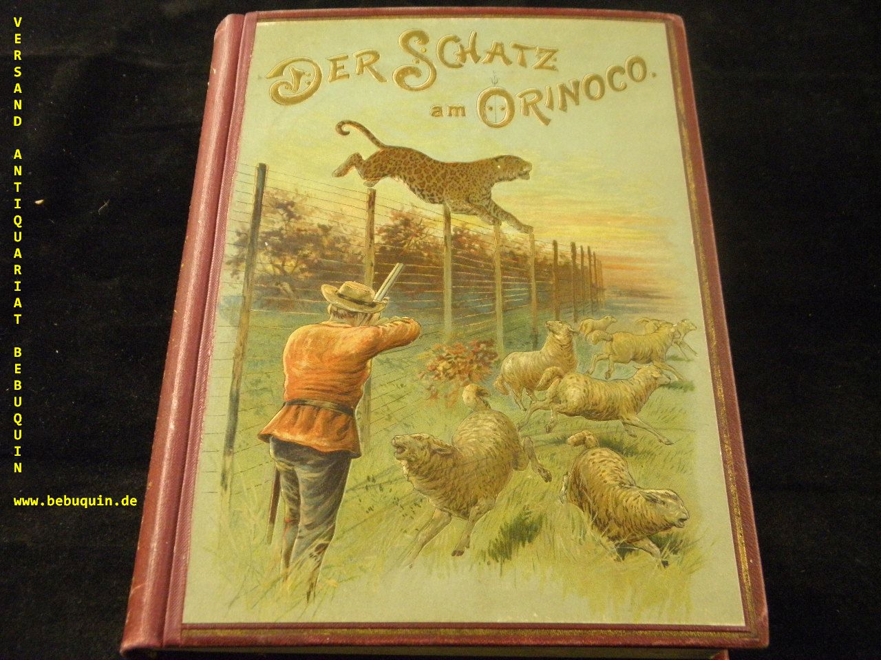 PAJEKEN, Friedrich F.: Der Schatz am Orinoco. Eine Erzählung aus den Tropen Südamerikas für die reifere Jugend. Stuttgart (Loewe), (1902). V, 230 (2)( S. mit 4 Bunt- und 4 Tonbildern. ill. OLn. mit motivischer Höhung. sehr feines Ex. EA Klotz 5284/22. Friedrich Joachim Pajeken (Bremen 1855 – 1920) war Kaufmann und Verfasser von Abenteuerromanen für Jugendliche. „1876 wurde er als Kaufmann nach Ciudad Bolívar am Orinoko geschickt, wo er in den nächsten drei Jahren Erfahrungen im Überseehandel sammelte. Seinen dortigen Aufenthalt nutzte er für zahlreiche Streifzüge durch das Land. Nebenbei befasste er sich eingehend mit den in Bolivien lebenden Indianern. Um auch die nordamerikanischen Indianer kennenzulernen, begab er sich für zwei Jahre auf die ‚Hollers Ranch‘ am Brod River in den Bighorn Mountains und knüpfte gute Kontakte zu den dort lebenden Indianern. Von diesen erhielt er aufgrund seiner etwas gelblichen Hautfarbe und seiner Leistungen als guter Jäger den Ehrennamen ’Yellow Eagle.“ (wikipedia).–