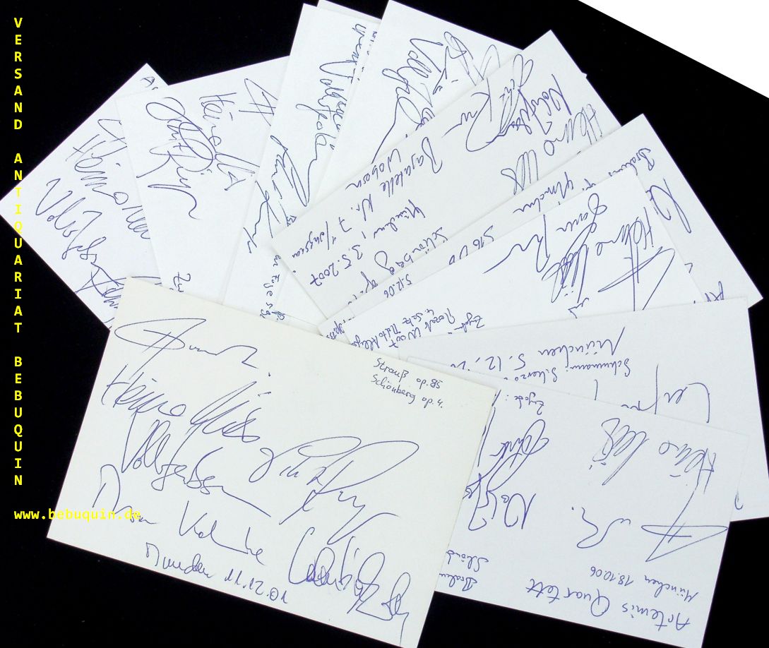 ARTEMIS QUARTETT.– PRISHEPENKO, Natalia + MÜLLER, Heime + JACOBSEN, Volker + RUNGE, Eckart: 14 eigenhändig von allen signierte und datierte Autogrammkarte + 6 ebensolche Portraitseite. München (Herkulessaal), 1997 – 2011. 20 x 13,5 + 8 x 12,5 cm. 20 Bl. Das Ensemble wurde 1989 in Lübeck gegründet und ist in Berlin ansässig. Mentoren waren Walter Levin, das Alban Berg Quartett, das Juilliard String Quartet und das Emerson String Quartet. Der Preis des Deutschen Musikwettbewerbs (1995) sowie erste Preise beim ARD Musikwettbewerb (1996) und beim Premio Paolo Borciani (1997) ebneten eine internationale Karriere. Heute gastiert es weltweit in allen großen internationalen Konzertreihen und Festivals. (Wikipedia)
