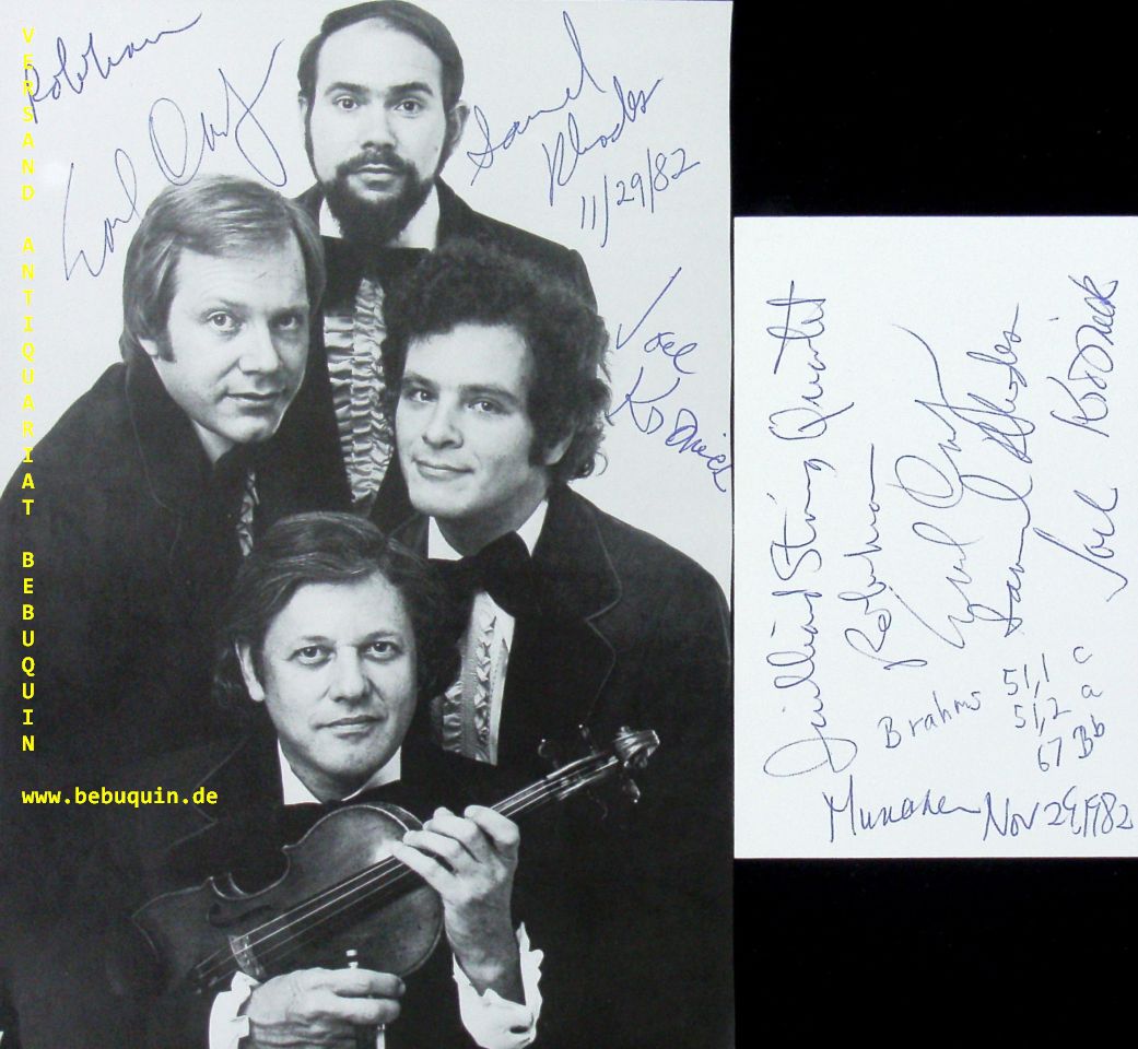 JUILLARD STRING QUARTET.– MANN, Robert + CARYLESS, Earl + RHODES, Samuel + KROSNICK, Joel: eigenhändig von allen signierte und datierte Autogrammkarte + ebenso signierte Portraitseite. München (Philharmonie), 24.11.1982. 21 x 15 + 8 x 12,5 cm. 6 Bl. . Das Juilliard String Quartet gehört seit 1947, dem Jahr seines ersten Auftretens, zu den führenden Streichquartettensembles der Welt. Mit über 100 Veröffentlichungen ist das Juilliard String Quartet eines der am meisten aufgenommenen Streichquartettensembles der Welt und konnte bislang vier Grammys gewinnen. (Wikipedia)