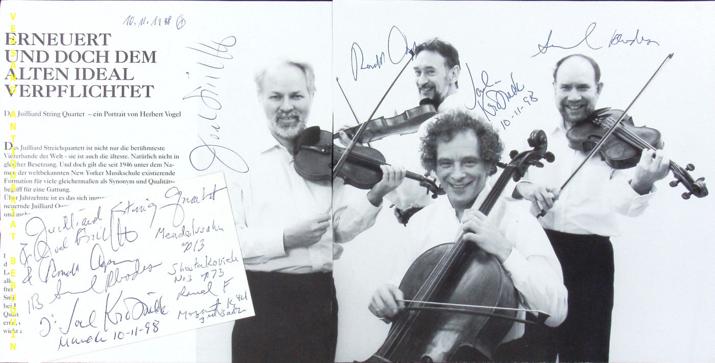 JUILLARD STRING QUARTET.– SMIRNOFF, Joel + COPES, Ronald + RHODES, Samuel + KROSNICK, Joel: eigenhändig von allen signierte und datierte Autogrammkarte + ebensolche Portraiseite in 2 Teilen. München (Philharmonie), 10.11.1998. 20 x 40 + 8 x 12,5 cm. 5 Bl. Das Juilliard String Quartet gehört seit 1947, dem Jahr seines ersten Auftretens, zu den führenden Streichquartettensembles der Welt. Mit über 100 Veröffentlichungen ist das Juilliard String Quartet eines der am meisten aufgenommenen Streichquartettensembles der Welt und konnte bislang vier Grammys gewinnen. (Wikipedia)