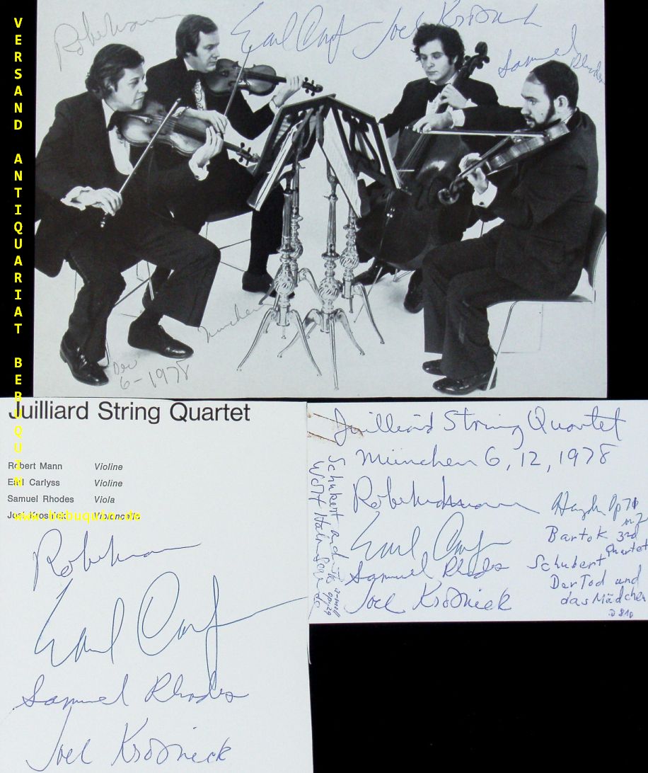 JUILLARD STRING QUARTET.– MANN, Robert + CARLYSS, Earl + RHODES, Samuel + KROSNICK, Joel: eigenhändig von allen signierte Portraitseite + eigenhändig von allen signierte und datierte Autogrammkarte. München (Philharmonie), 6.12.1978. 21 x 14,5 + 8 x 12,5 cm 4 Bl. Karteikarte mit leichter Rostspur. Das Juilliard String Quartet gehört seit 1947, dem Jahr seines ersten Auftretens, zu den führenden Streichquartettensembles der Welt. Mit über 100 Veröffentlichungen ist das Juilliard String Quartet eines der am meisten aufgenommenen Streichquartettensembles der Welt und konnte bislang vier Grammys gewinnen. (Wikipedia)