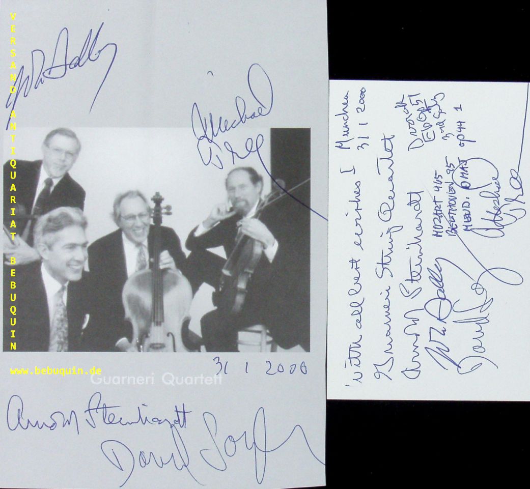 GUARNERI QUARTETT.– STEINHARDT, Arnold + DALLEY, John + TREE, Michael + SOYER, David: eigenhändig von allen signierte und datierte Autogrammkarte + von allen signierte Portraitseite. München (Herkulessaal), 31.1.2000. 19,5 x 13 cm. 2 Bl. Das 1964 gegründete Guarneri String Quartet (auch Guarneri Quartet) ist eines der weltweit bedeutendsten Streichquartett-Ensembles. Es ist in New York beheimatet. (Wikipedia)