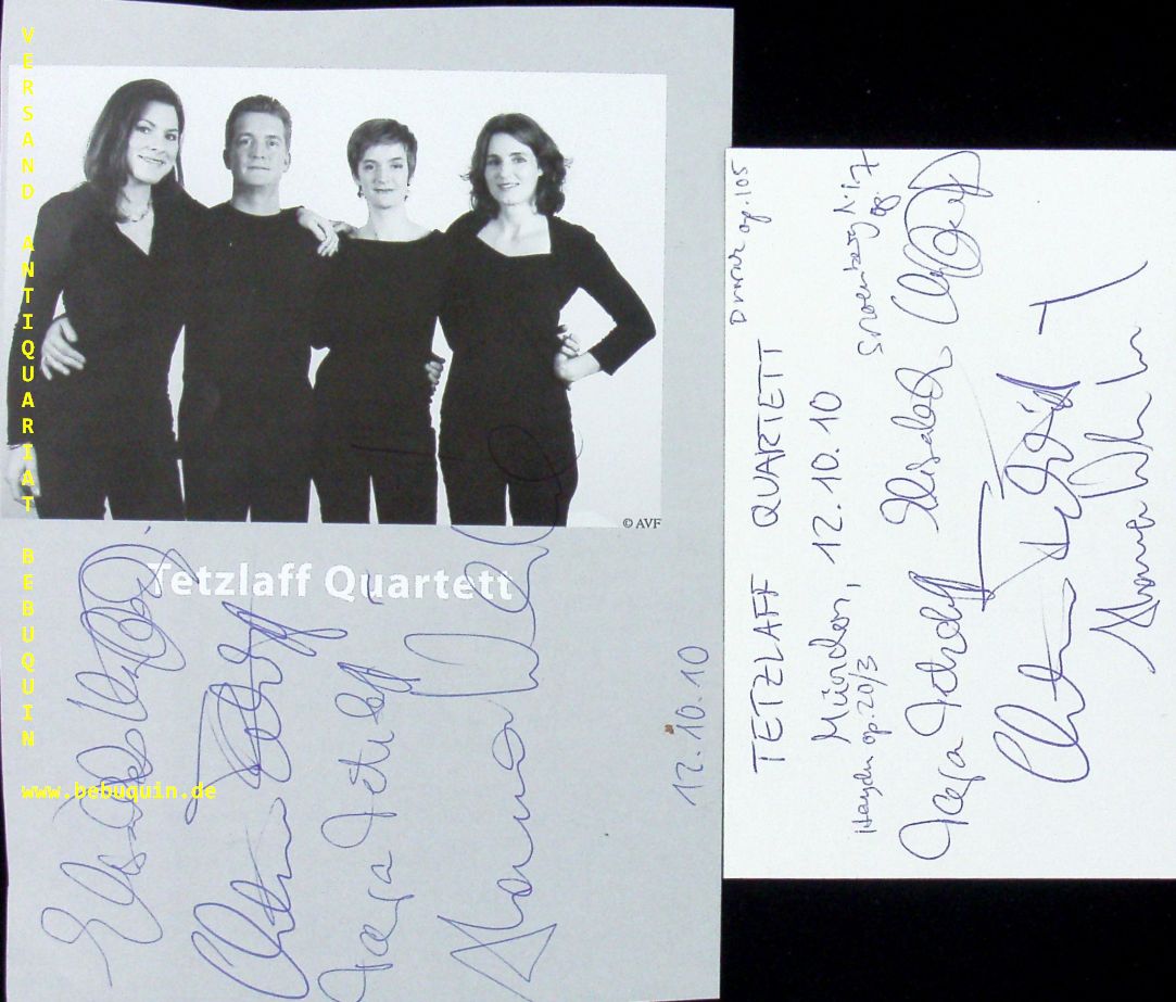 TETZLAFF QUARTETT.– TETZLAFF, Christian + KUFFERATH, Elisabeth + WEINMEISTER, Hanna + TETZLAFF, Tanja: eigenhändig von allen signierte und datierte Autogrammkarte + von allen signierte Portraitseite. München (Herkulessaal), 12.10.2010. 18,5 x 13,5 + 8 x 12,5 cm. 3 Bl. Die gemeinsame Leidenschaft für Kammermusik führte Christian und Tanja Tetzlaff sowie Hanna Weinmeister und Elisabeth Kufferath 1994 zur Gründung eines Streichquartetts – das Tetzlaff Quartett war geboren. Seither hat sich dieses Ensemble zu einem der gefragtesten Quartette der mittleren Generation entwickelt.