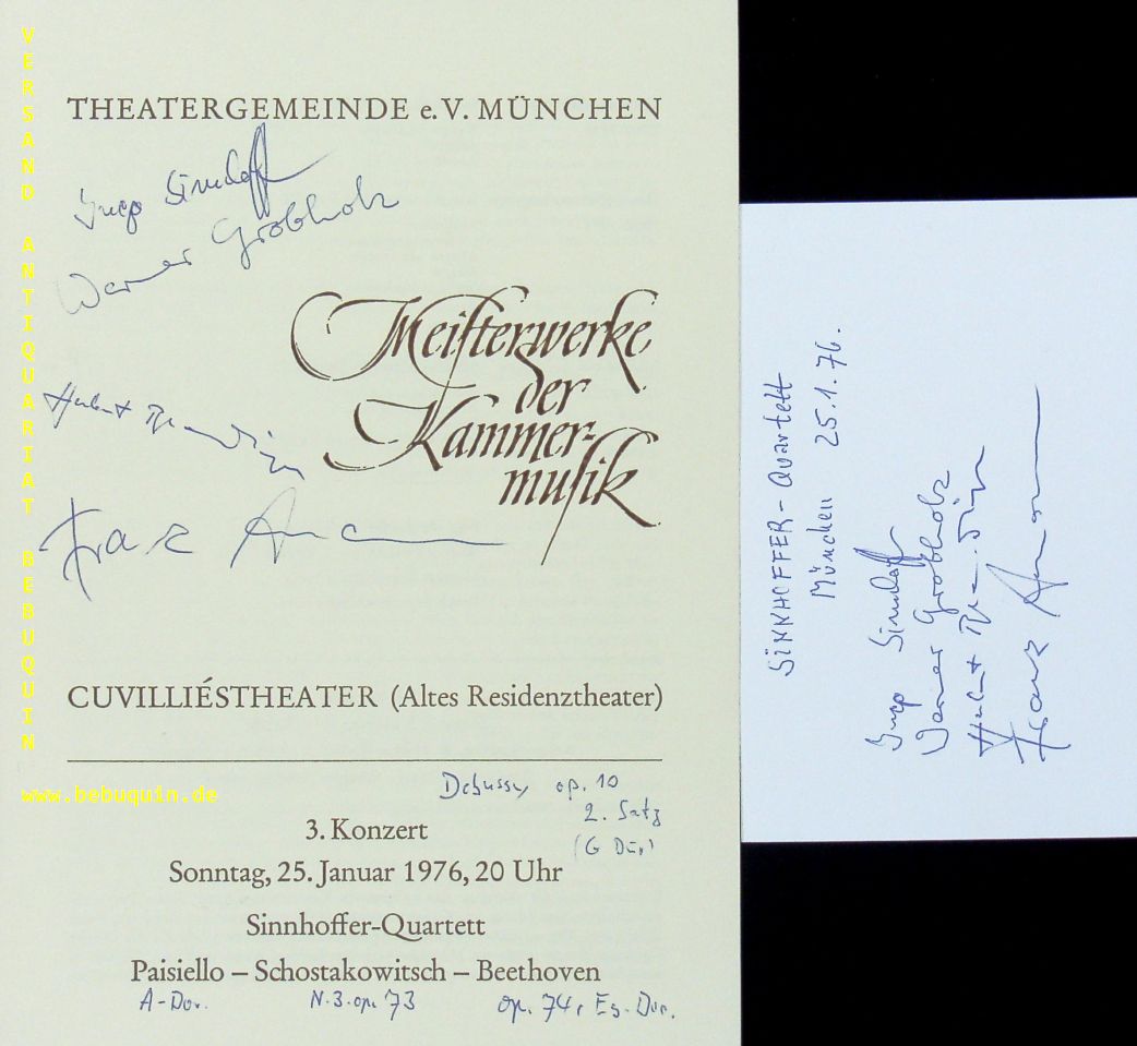 SINNHOFFER QUARTETT.– SINNHOFFER, Ingo + GROBHOLZ, Werner + BLENDINGER, Herbert + AMANN, Franz: eigenhändig von allen signierte und datierte Autogrammkarte. München (Residenztheater), 25.1.1976. 8 x 12,5 cm. Karteikarte in Programmheft. Im Sinnhoffer Quartett, 1963 gegründet, haben sich 4 profilierte Münchner Musiker gefunden.