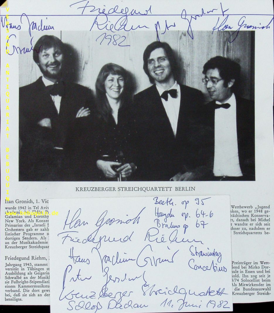 KREUZBERGER STREICHQUARTETT.– GRONICH, Ilan + RIEHM, Friedegrund + GREINER, Hans Joachim + GERSCHWITZ, Peter: eigenhändig von allen signierte und datierte Portraitseite + ebenso signierte Autogrammkarte. München (Schloß Dachau), 11.6.1982. 21,5 x 19,5 cm. 2 Bl.