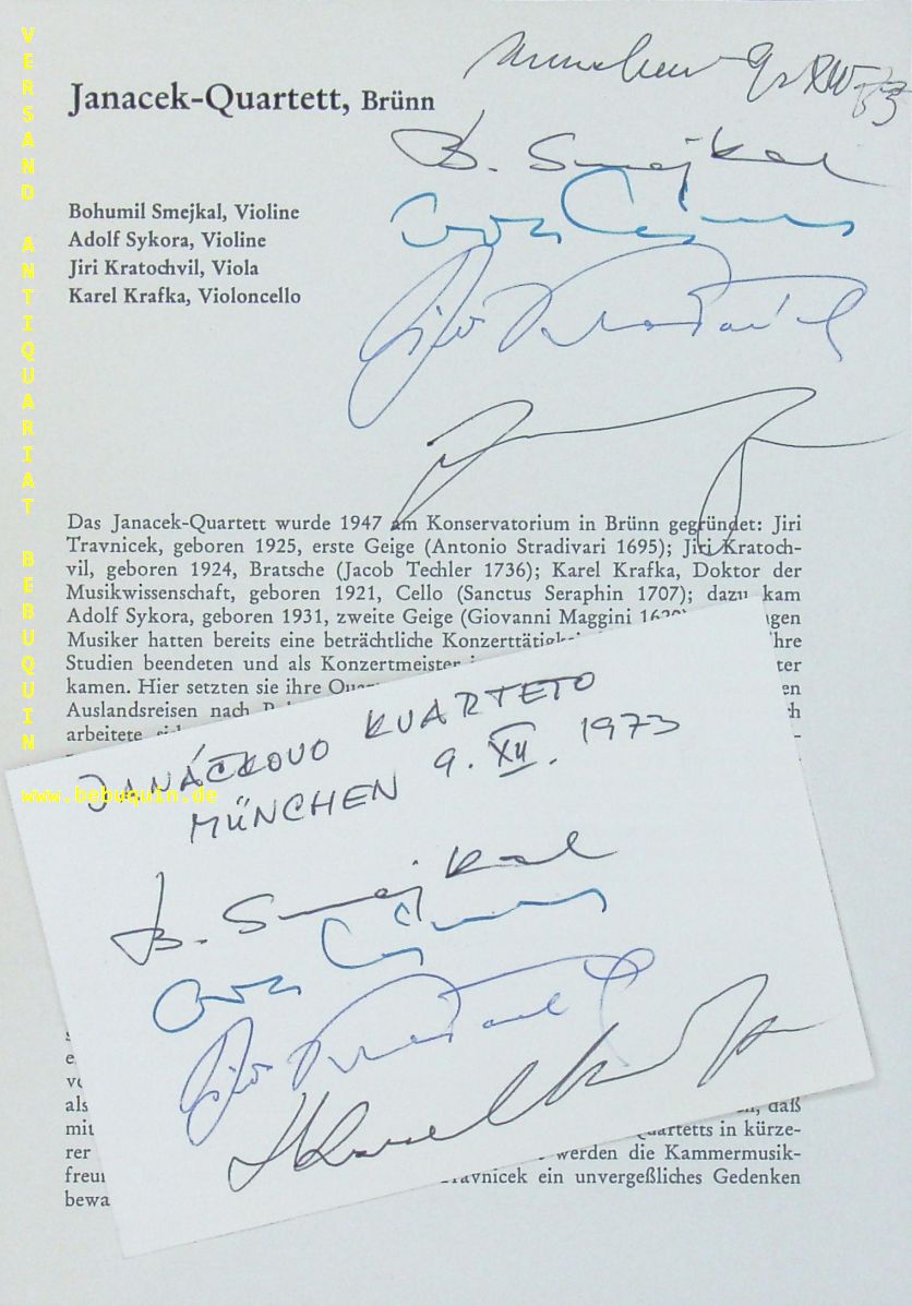 JANACEK QUARTETT.– SMEJKAL, Bohumil + SYKORA, Adolf + KRATOCHVIL, Jiri + KRAFKA, Katrel: eigenhändig von allen signierte und datierte Autogrammkarte + von allen signierte Programmseite. München (Herkulessaal), 6.7.1977. 21 x 15 + 8 x 12,5 cm. 2 Bl. The Janácek Quartet (Czech: Janáckovo kvarteto) is a Czech string quartet musical ensemble founded in 1947 which is still currently active. (Wikipedia)