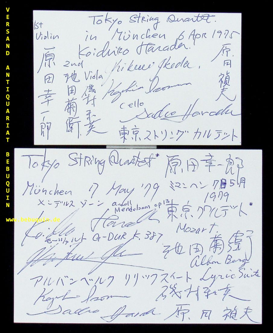 TOKYO STRING QUARTET: HARADA, Koichiro + IKEDA, Kikuei + ISOMURA, Kazuhide + HARADA, Sadao: 2 eigenhändig von allen signierte und datierte Autogrammkarte. München (Herkulessaal), 1975 + 1979. 10,5 x 14,5 cm. 7 Bl. Das Tokyo String Quartet war ein renommiertes Streichquartettensemble, das 1969 an der Juilliard School of Music gegründet wurde und sich im Juli 2013 auflöste. (Wikipedia)