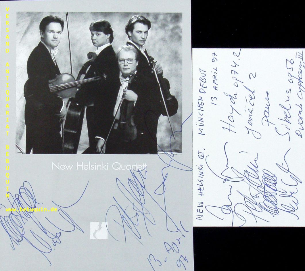 NEW HELSINKI QUARTETT.– SÖDERBLOM, Jan + AARNIO, Petri + ANGERVO, Ilari + YLÖNEN, Maro: eigenhändig von allen signierte Autogrammkarte + signierte Portraitseite von den Gästen. München (Philharmonie), 13.4.1997. 19,5 x 14 + 8 x 12,5 cm. 4 Bl.