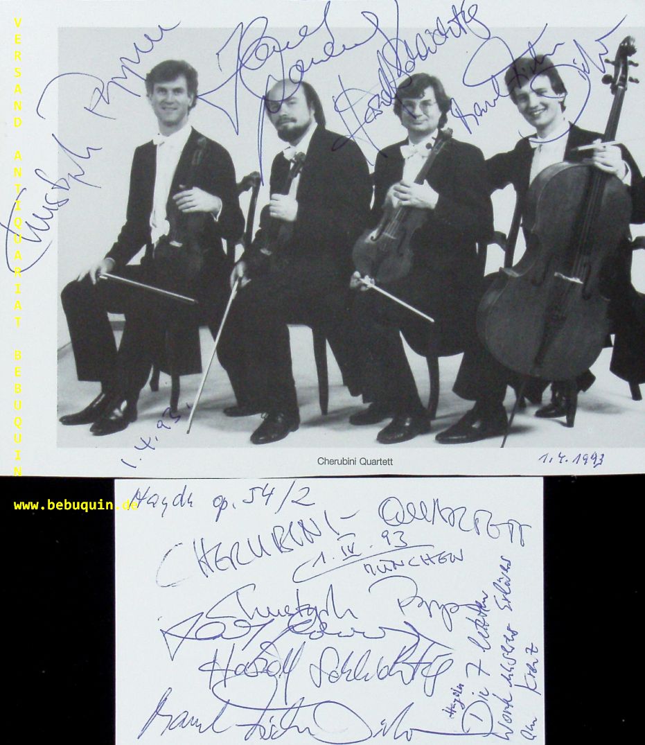 CHERUBINI QUARTETT.– POPPEN, Christoph + SCHÖNEWEG, Harald + SCHLICHTIG, Hariolf + KÄMPER, Klaus: eigenhändig von allen signierte und datierte Autogrammkarte + ebensolche Portraitseite. München (Herkulessaal), 1.4.1993. 4 Bl. Das Cherubini-Quartett war ein führendes deutsches Streichquartett aus Düsseldorf, das im Jahr 1978/79 gegründet wurde. (Wikipedia)